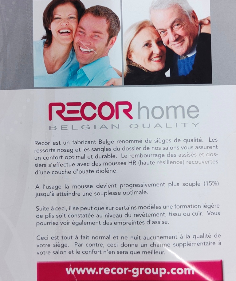 Firma RECOR HOME patří k nejznámějším belgickým výrobcům čalouněného nábytku - je reprezentantem těch nejlepších tradic belgické řemeslnické výroby. Je rodinnou firmou s mnoholetou tradicí výroby sedacích souprav, která je zcela realizovaná v Belgii.